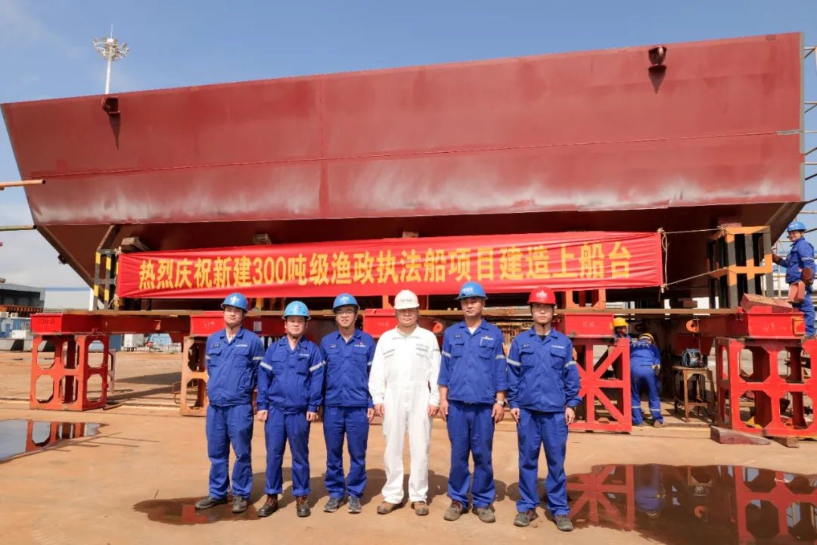等不了一點!新建300噸級漁政執法船順利上船臺