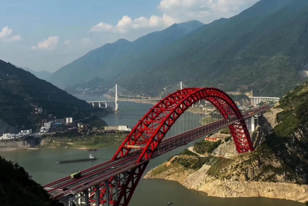 秭歸長江大橋為主跨519m中承式鋼桁架拱橋,拱肋采用空間變截面桁架式結(jié)構(gòu),桁架采用雙片主桁,上下游兩榀主桁平行布置,通過縱橫連接系栓接連接。總用鋼量約為1.72萬噸,該項目是公司承接第一座栓焊連接、大跨度鋼桁拱橋。該橋是目前世界已建成最大跨度的鋼箱桁架推力拱橋,在同類橋梁中,技術(shù)難度世界第三,凈空高度亞洲第一,整座橋主跨沒有橋墩,由23節(jié)鋼箱桁架拼起“彩虹”似的橋拱。大橋于2019年國慶前夕建成通車。
