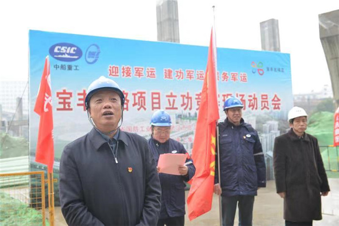 省國防工會主任袁善謀,武漢市總工會副主席李兵、武漢市國防科研工會主席王躍初,武船集團黨委副書記、工會主席楊少稀出席啟動儀式。李兵向武船寶豐北路項目公司授予了“攻堅突擊隊”旗幟。本次活動旨在以立功競賽為載體,樹立勞動競賽典型,宣傳軍工企業文化,積極引導職工投身到“建功新時代”熱潮中,加快推進寶豐北路項目建設,為武漢人民做貢獻,為軍運會的順利召開提供可靠的保障。