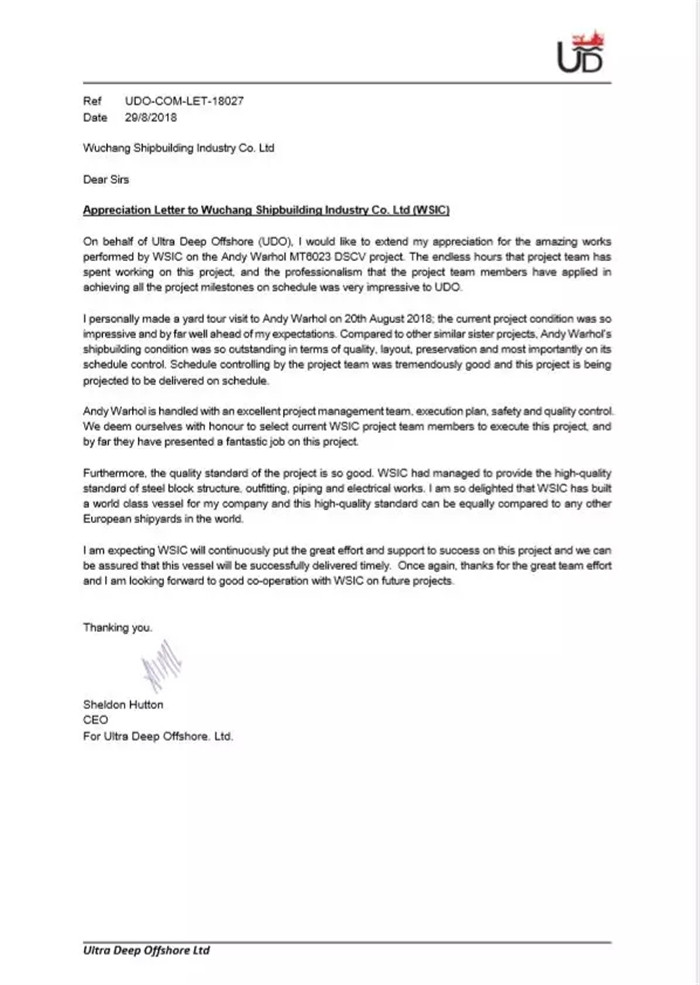 精益求精,再獲贊譽 | 武船造”MT6023項目”收到船東表揚信