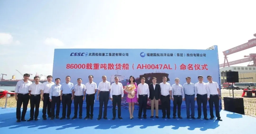 8月23日,中國(guó)船舶武船集團(tuán)北船重工為福建國(guó)航遠(yuǎn)洋運(yùn)輸(集團(tuán))股份有限公司建造的86000噸散貨船首制船在北船重工3號(hào)碼頭舉行命名暨啟航儀式,北船重工總經(jīng)理谷克超主持儀式,北船重工董事長(zhǎng)王國(guó)海與福建國(guó)航副總裁韓青先后致辭,福建國(guó)航副總裁張軼女士將本船命名為“國(guó)遠(yuǎn)82”輪,并在福建國(guó)航董事長(zhǎng)兼總裁王炎平和武船集團(tuán)董事長(zhǎng)陳?降募?證下為本船砍纜、敲香檳酒。