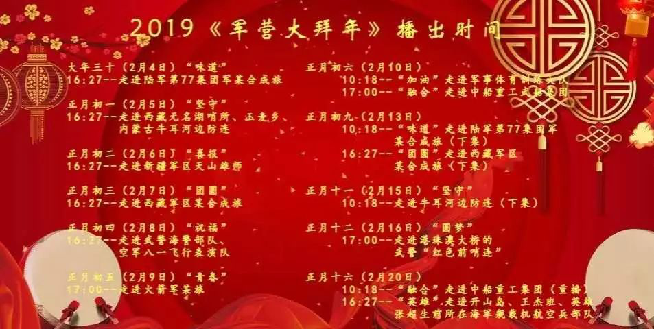 《“融合”走進中船重工武船集團》將于2月9日,大年初五8點檔在央視一套和央視三套共同播出。2月10日,大年初六17:00-18:00在央視七套播出。下面是《軍營大拜年》節目在央視七套的播出時間表,敬請觀看!