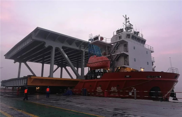 斜船架經(jīng)過45分鐘的下行,滑行到達指定水域,等待的運輸船舶盛暢7#迅速起錨靠近斜船架,固定纜繩、對準搭接通道、左舷壓水,項目部、起重運輸部和雙柳公司等20余人的發(fā)運團隊各就各位,各司其職,一系列的準備工作嫻熟而利落。隨后操作人員啟動模塊車,在指揮人員的指令中,緩緩上船。3排軸線上船后,船右舷傾斜下沉,對講機中不斷傳來操作指令:斜船架1檔下行、停止、左舷繼續(xù)壓水、模塊車低速前進……,模塊車前輪越過中線后,船體逐漸向左舷復位傾斜,對講機中操作指令又不斷清晰傳來:斜船架上拉、左舷壓水停止、模塊車繼續(xù)前進……。