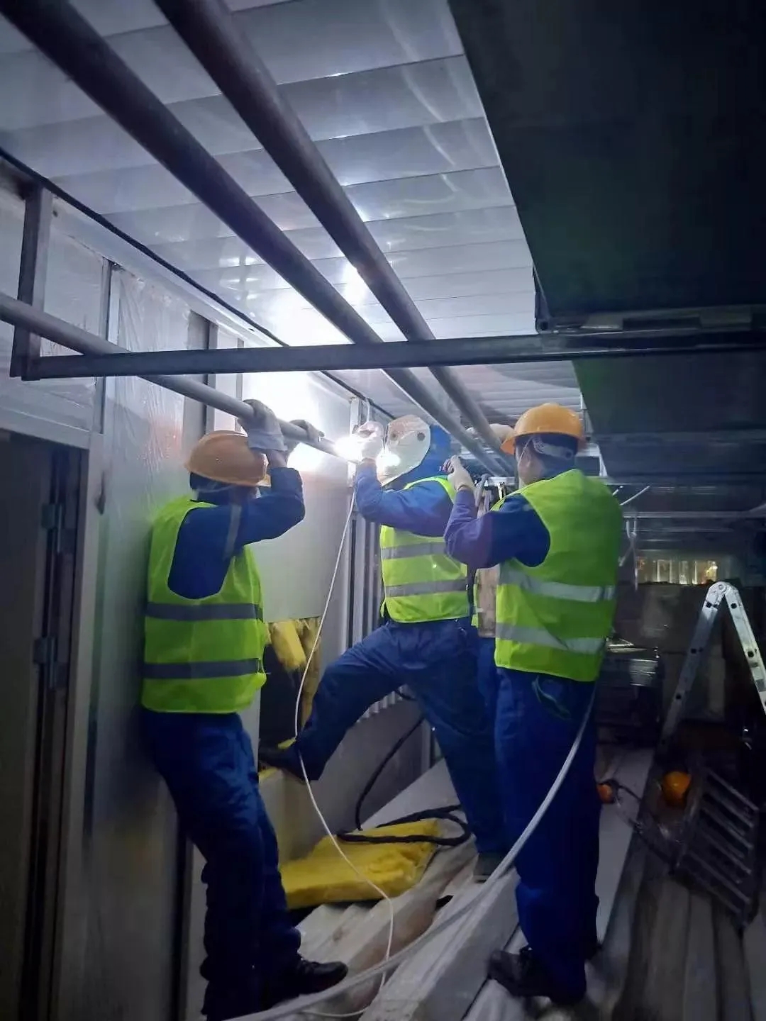 緊接著,操起電焊工的老本行。一時間,氬弧焊耀眼的白光將施工區(qū)域的長廊照的通透!