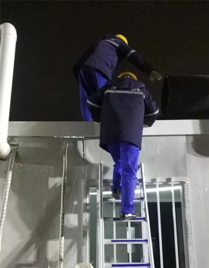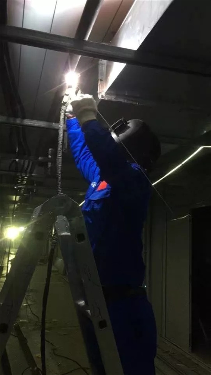 焊接時,大家發現這里的所有管件都沒有坡口,且裝焊時需要踩著梯子、抬著管子、仰著頭,卡在風管和電纜中間僅20-30cm的間隙內操作,但這些對于“久經沙場”的軍工師傅們來說真的不值一提。
