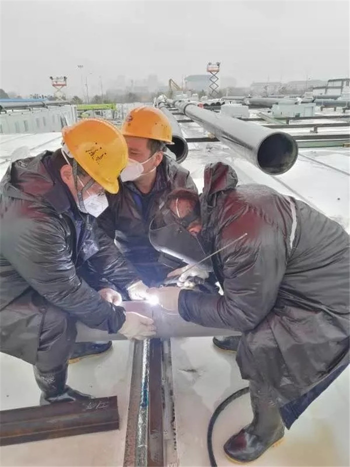 “雷神山頂樓天臺A6、A8區域供氧管路,共由300余米直徑110mm主管、600余米直徑48mm、89mm支管及少量三通管件組成。2月5日晚下了一場大雨,造成天臺積水。2月6日清晨,我們施工時,天空仍飄著淅淅瀝瀝的小雨,還伴著2-3級的東北風,這些環境因素主要給我們的焊接工作造成了一定程度上的影響。”陳小軍介紹道。