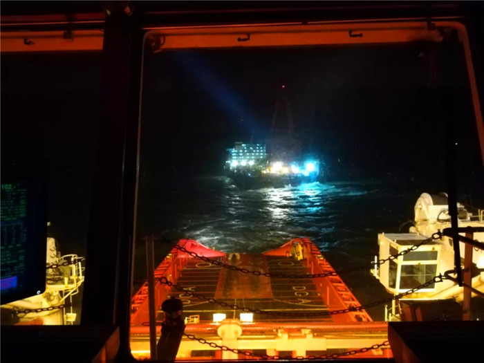 9月17日零時,“華虎”輪完成接拖全部準備工作,而后撇纜、連接小絞車鋼絲,緊接著“海洋石油202”輪錨纜上甲板、連接錨纜和拖帶鋼纜、錨纜外放110米....引纜傳遞成功、絞車鋼絲傳遞成功、拖纜連接成功、纜車長度調(diào)整到位,各項工作就緒,“華虎”輪開始向外移動!由于“海洋石油202”輪是右船艏觸礁,在當時的情況下只能橫向或者往左后牽引,近乎于橫風拖帶!橫風拖帶不僅難度非常大,只要一不留神操作不當或船舶性能失衡,“華虎”輪隨時會面臨失位風險!風小時,抓緊時機側面受風往外拉,風大時,立即調(diào)整自身船態(tài)。“華虎”輪就這樣在波濤洶涌的海浪中與“山竹”周旋著,經(jīng)過3個小時的鏖戰(zhàn),“海洋石油202”輪成功脫淺!單根鋼纜拖帶,穿越一方航道,避開航道燈標和幾條拋錨船,又經(jīng)過2個多小時,“海洋石油202”輪在“華虎”輪的牽引下安全抵達錨地拋錨!