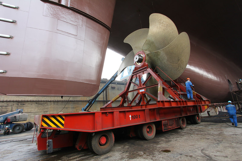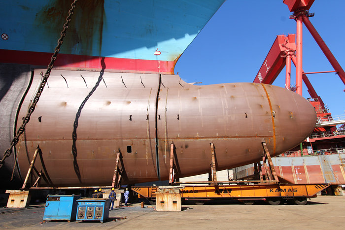 “臺(tái)車法”更換球鼻艏和推進(jìn)器為世界首創(chuàng),大大降低工期和成本,提高了質(zhì)量和效率。