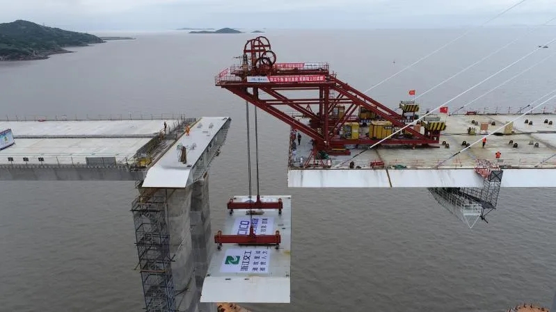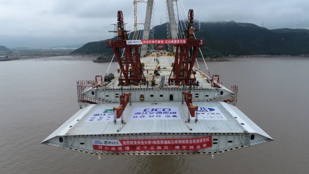 6月22日,中國船舶武船集團武船重工股份承建的舟岱大橋DSSG01標南通航孔橋最后一節鋼箱梁吊裝完成,精準落位,南通航孔橋率先實現邊跨合龍,較計劃合龍時間節點提前了6天。
