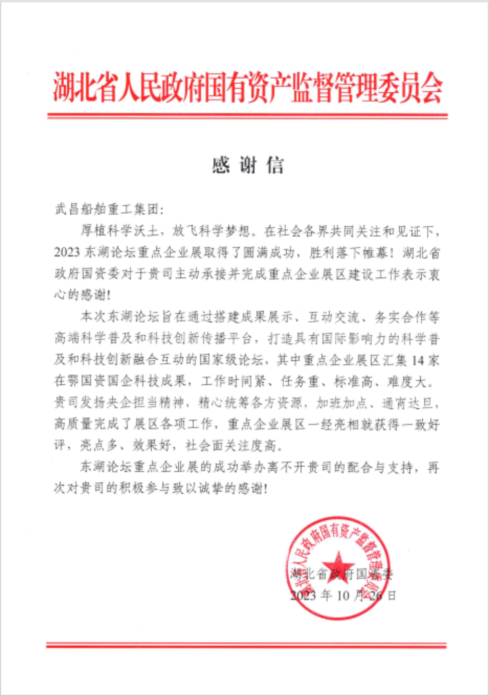 “發(fā)揚(yáng)央企擔(dān)當(dāng)精神,精心統(tǒng)籌各方資源”“亮點(diǎn)多,效果好,社會(huì)面關(guān)注度高”......這是來自湖北省政府國(guó)資委的感謝信對(duì)武昌造船的贊揚(yáng)!